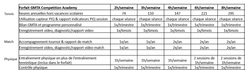 Afin d’être admis au programme GMTA Competition Academy, le minimum d’heures d’entrainement tennistiques par semaine est d’au minimum 2 heures.